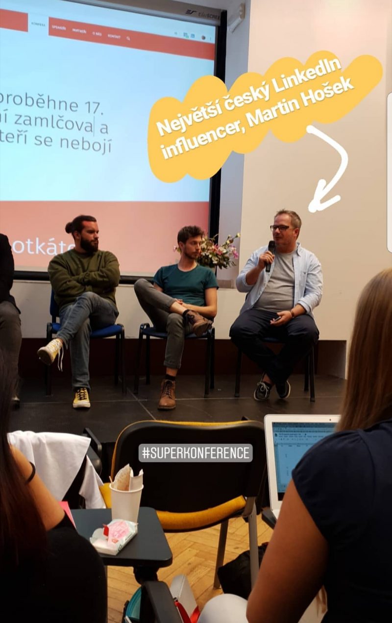 Potěšilo mě, že se na Konfeře nezapomnělo na často opomíjený LinkedIn. Třetím hostem byl přímo největší český LinkedIn influencer (22 000 spojení), Martin Hošek. Sálem znovu zazněla mantra „hlavně být svůj, na nic si nehrát“. Svůj profil buduje už 6 let, každý den se mu věnuje 2 hodiny a bere to celé jako sociální pokus.