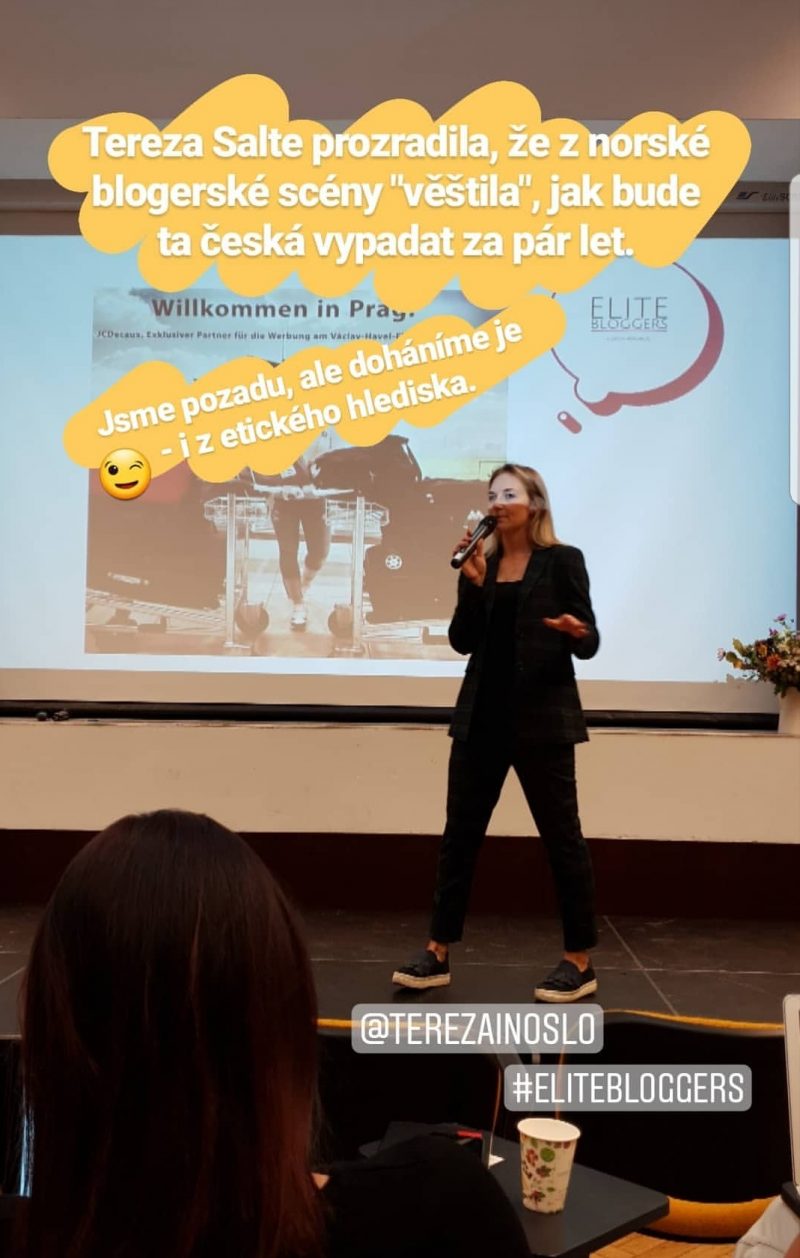 Po obědě bylo velice příjemné poslechnout si přednášku Terezy Salte (@terezainoslo), která se od opakované výhry blogerky roku dostala až k založení Elite Blogers a bojuje u nás za etické blogování jak mezi influencery, tak i u firem. A co že znamená etické blogování/postování? Například vždy viditelně označit placený příspěvek jako spolupráci či reklamu.